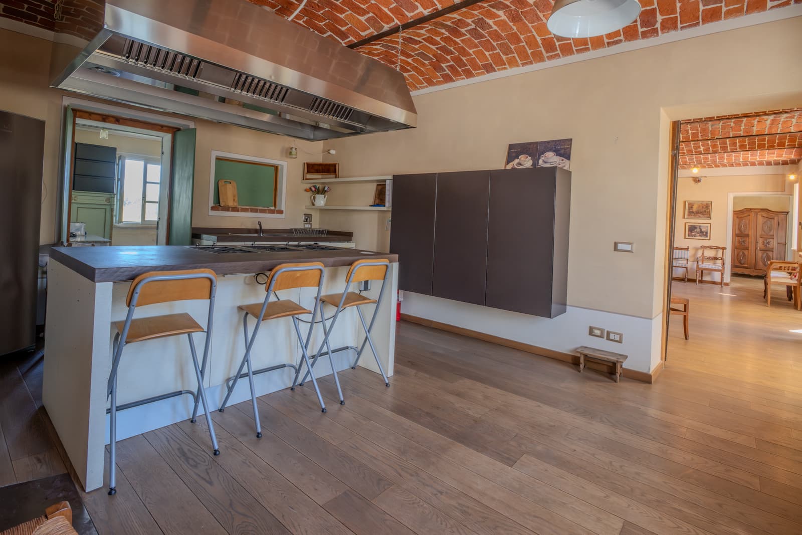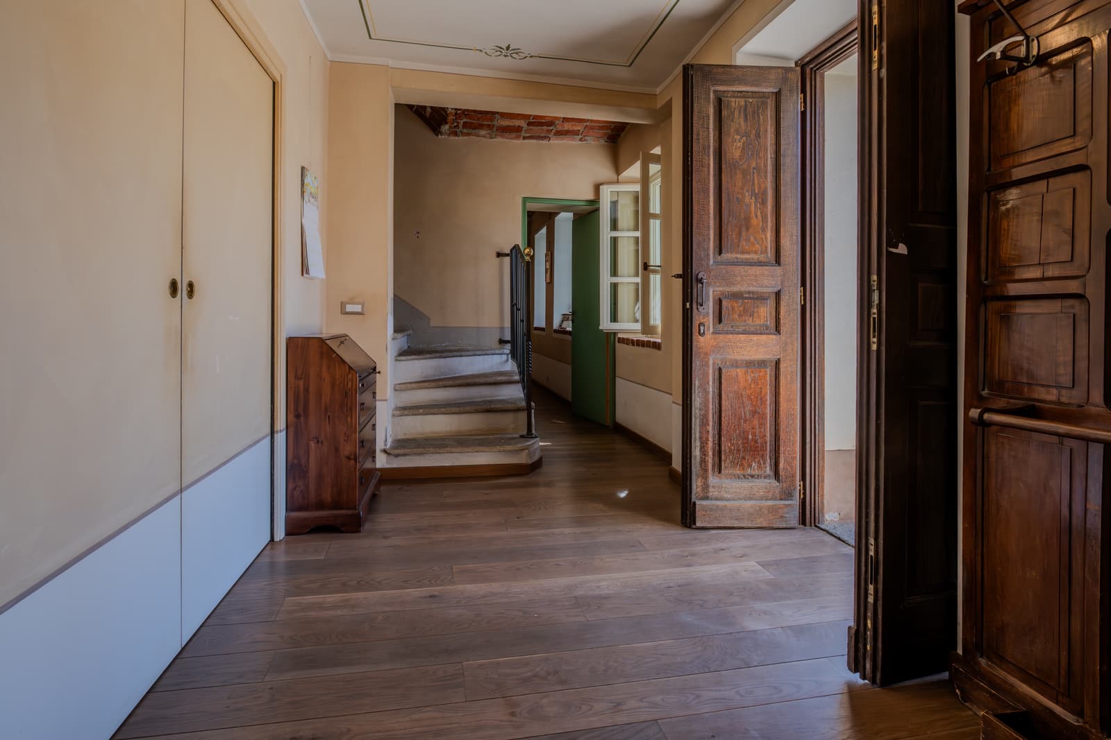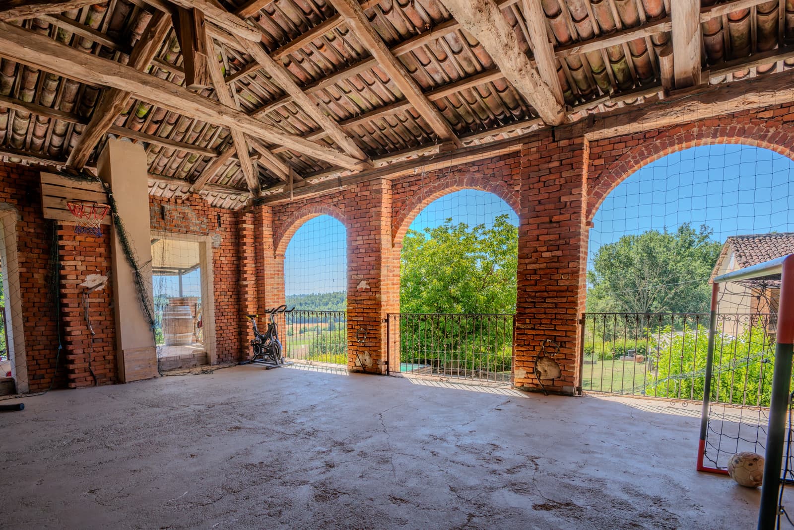 – al primo piano da, 3 camere disimpegnate fra loro, 3 bagni, un caratteristico fienile (portico aperto) con 3 classici archi in mattoni cotti a vista, 2 terrazzi e un balcone che godono di una splendida vista panoramica.