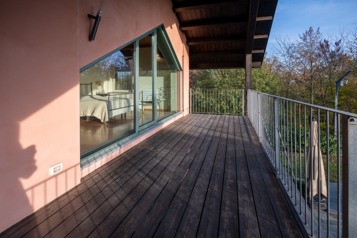 Salendo al piano primo, troviamo un arioso disimpegno/studio, due grandi camere da letto, un bagno, una lavanderia e una luminosa camera master con bagno en suite; tutto il piano è arricchito da numerose porte-finestre che permettono di accedere comodamente, da ogni ambiente, a una generosa balconata (con pavimentazione in legno) che si affaccia sulle dolci colline monferrine.